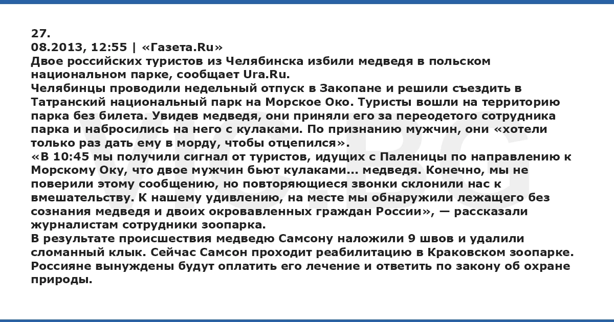 Челябинцы проводили недельный отпуск в Закопане и решили съездить в Татранский национальный парк на Морское Око. Туристы вошли на территорию парка без билета. Увидев медведя, они приняли его за переодетого сотрудника парка и набросились на него с кулаками. По признанию мужчин, они «хотели только раз дать ему в морду, чтобы отцепился».
