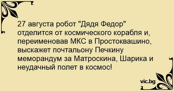 27 августа робот "Дядя Федор" отделится от космического корабля и, переименовав МКС в Простоквашино, выскажет почтальону Печкину меморандум за Матроскина, Шарика и неудачный полет в космос!