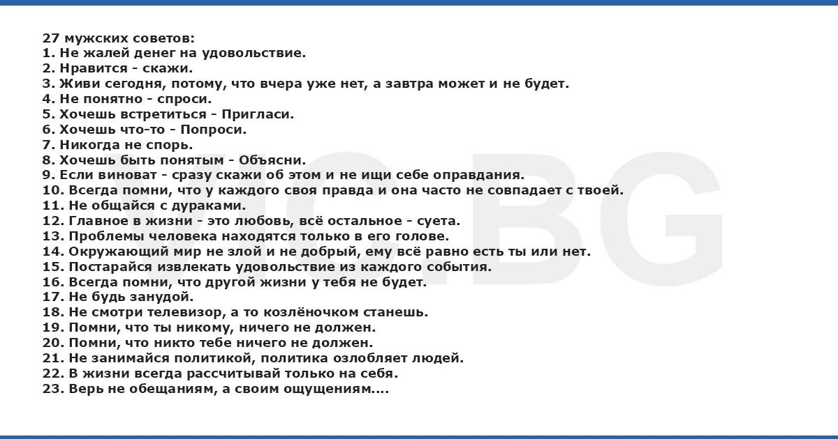 27 мужских советов: 1. Не жалей денег на удовольствие. 2. Нравится - скажи. 3. Живи сегодня, потому, что вчера уже нет, а завтра может и не будет. 4. Не понятно - спроси. 5. Хочешь встретиться - Пригласи. 6. Хочешь что-то - Попроси. 7. Никогда не спорь. 8. Хочешь быть понятым - Объясни. 9. Если виноват - сразу скажи об этом и не ищи себе оправдания. 10. Всегда помни, что у каждого своя правда и она часто не совпадает с твоей. 11. Не общайся с дураками. 12. Главное в жизни - это любовь, всё остальное - суета. 13. Проблемы человека находятся только в его голове. 14. Окружающий мир не злой и не добрый, ему всё равно есть ты или нет. 15. Постарайся извлекать удовольствие из каждого события. 16. Всегда помни, что другой жизни у тебя не будет. 17. Не будь занудой. 18. Не смотри телевизор, а то козлёночком станешь. 19. Помни, что ты никому, ничего не должен. 20. Помни, что никто тебе ничего не должен. 21. Не занимайся политикой, политика озлобляет людей. 22. В жизни всегда рассчитывай только на себя. 23. Верь не обещаниям, а своим ощущениям. 24. С женщинами, как и с детьми, будь терпеливым и немного снисходительным. 25. Жалей всех женщин - им сложней жить. 26. Если у тебя плохое настроение, подумай, что когда ты умрёшь, то у тебя и этого не будет. 27. Знай, что сегодняшний день - это самый лучший день твоей жизни.