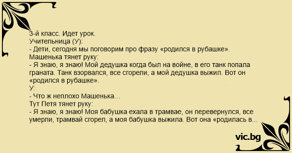 - Я знаю, я знаю! Моя бабушка ехала в трамвае, он перевернулся, все умерли, трамвай сгорел, а моя бабушка выжила. Вот она «родилась в рубашке».