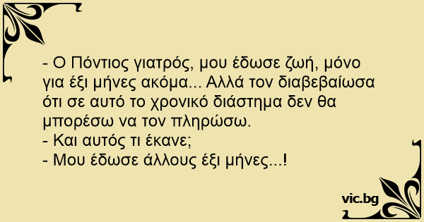 - Ο Πόντιος γιατρός, μου έδωσε ζωή, μόνο για έξι μήνες ακόμα... Αλλά τον διαβεβαίωσα ότι σε αυτό το χρονικό διάστημα δεν θα μπορέσω να τον πληρώσω.