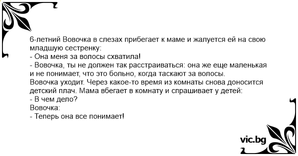 - Вовочка, ты не должен так расстраиваться: она же еще маленькая и не понимает, что это больно, когда таскают за волосы.