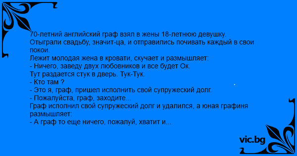 Богат 90 годишен дедо се оженил со некоја доста помлада од него, 25 годишна женска. Прва брачна ноќ. Дедото чука на вратата од спалната и вели: