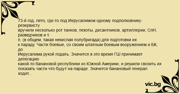 73-й год, лето, где-то под Иерусалимом одному подполковнику-резервисту вручили несколько рот танков, пехоты, десантников, артиллерии, СпН, разведчиков и т.