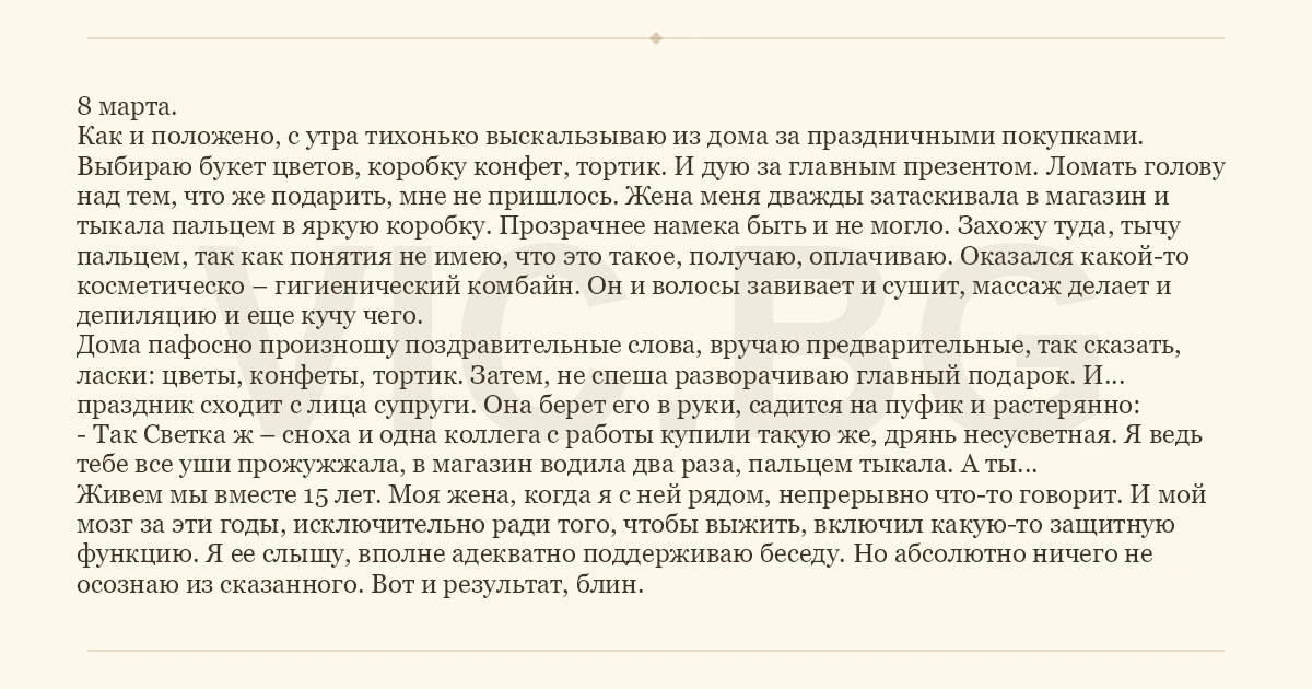8 марта. Как и положено, с утра тихонько выскальзываю из дома за праздничными покупками. Выбираю букет цветов, коробку конфет, тортик. И дую за главным презентом. Ломать голову над тем, что же подарить, мне не пришлось. Жена меня дважды затаскивала в магазин и тыкала пальцем в яркую коробку. Прозрачнее намека быть и не могло. Захожу туда, тычу пальцем, так как понятия не имею, что это такое, получаю, оплачиваю. Оказался какой-то косметическо – гигиенический комбайн. Он и волосы завивает и сушит, массаж делает и депиляцию и еще кучу чего. Дома пафосно произношу поздравительные слова, вручаю предварительные, так сказать, ласки: цветы, конфеты, тортик. Затем, не спеша разворачиваю главный подарок. И... праздник сходит с лица супруги. Она берет его в руки, садится на пуфик и растерянно: - Так Светка ж – сноха и одна коллега с работы купили такую же, дрянь несусветная. Я ведь тебе все уши прожужжала, в магазин водила два раза, пальцем тыкала. А ты... Живем мы вместе 15 лет. Моя жена, когда я с ней рядом, непрерывно что-то говорит. И мой мозг за эти годы, исключительно ради того, чтобы выжить, включил какую-то защитную функцию. Я ее слышу, вполне адекватно поддерживаю беседу. Но абсолютно ничего не осознаю из сказанного. Вот и результат, блин.