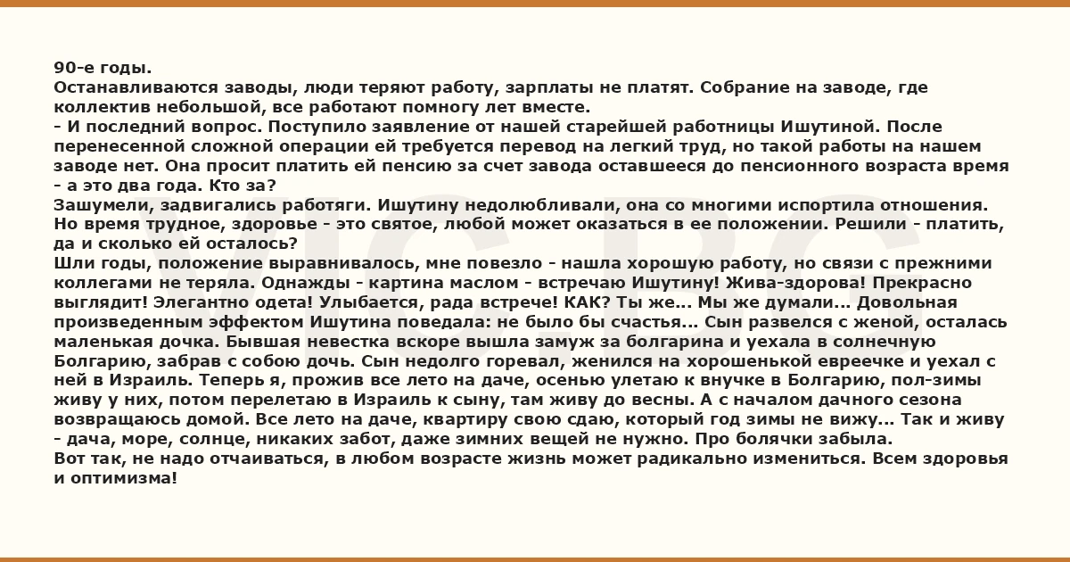 90-е годы. Останавливаются заводы, люди теряют работу, зарплаты не платят. Собрание на заводе, где коллектив небольшой, все работают помногу лет вместе. - И последний вопрос. Поступило заявление от нашей старейшей работницы Ишутиной. После перенесенной сложной операции ей требуется перевод на легкий труд, но такой работы на нашем заводе нет. Она просит платить ей пенсию за счет завода оставшееся до пенсионного возраста время - а это два года. Кто за? Зашумели, задвигались работяги. Ишутину недолюбливали, она со многими испортила отношения. Но время трудное, здоровье - это святое, любой может оказаться в ее положении. Решили - платить, да и сколько ей осталось? Шли годы, положение выравнивалось, мне повезло - нашла хорошую работу, но связи с прежними коллегами не теряла. Однажды - картина маслом - встречаю Ишутину! Жива-здорова! Прекрасно выглядит! Элегантно одета! Улыбается, рада встрече! КАК? Ты же... Мы же думали... Довольная произведенным эффектом Ишутина поведала: не было бы счастья... Сын развелся с женой, осталась маленькая дочка. Бывшая невестка вскоре вышла замуж за болгарина и уехала в солнечную Болгарию, забрав с собою дочь. Сын недолго горевал, женился на хорошенькой евреечке и уехал с ней в Израиль. Теперь я, прожив все лето на даче, осенью улетаю к внучке в Болгарию, пол-зимы живу у них, потом перелетаю в Израиль к сыну, там живу до весны. А с началом дачного сезона возвращаюсь домой. Все лето на даче, квартиру свою сдаю, который год зимы не вижу... Так и живу - дача, море, солнце, никаких забот, даже зимних вещей не нужно. Про болячки забыла. Вот так, не надо отчаиваться, в любом возрасте жизнь может радикально измениться. Всем здоровья и оптимизма!