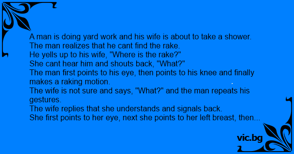 The wife is not sure and says, "What?" and the man repeats his gestures.