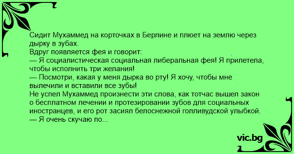Не успел Мухаммед произнести эти слова, как тотчас вышел закон о бесплатном лечении и протезировании зубов для социальных иностранцев, и его рот засиял белоснежной голливудской улыбкой.