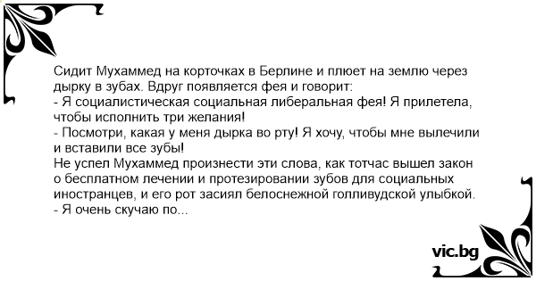 Не успел Мухаммед произнести эти слова, как тотчас вышел закон о бесплатном лечении и протезировании зубов для социальных иностранцев, и его рот засиял белоснежной голливудской улыбкой.