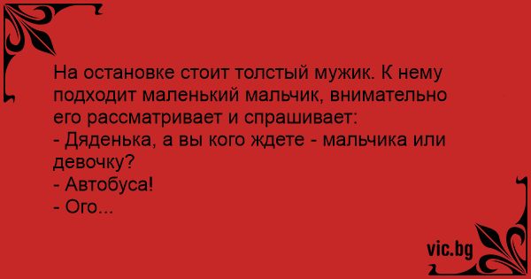 Hа остановке стоит толстый мужик. К нему подходит маленький мальчик, внимательно его pассматpивает и спpашивает: