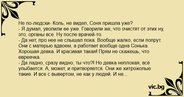 - Да нет, про нее не слышал пока. Вообще жалко, если попрут. Они с матерью вдвоем, а работает вообще одна Сонька. Хорошая девка. И красивая такая! Прям не скажешь, что евреечка.