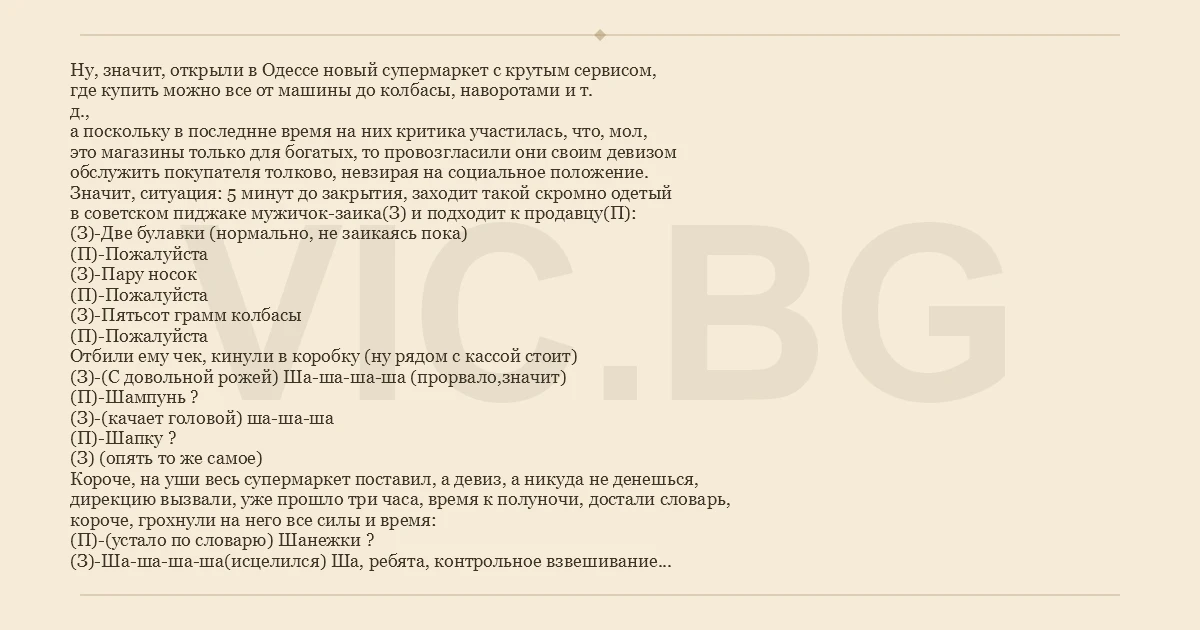 Hу, значит, открыли в Одессе новый супермаркет с крутым сервисом, где купить можно все от машины до колбасы, наворотами и т. д., а поскольку в последнне время на них критика участилась, что, мол, это магазины только для богатых, то провозгласили они своим девизом обслужить покупателя толково, невзирая на социальное положение. Значит, ситуация: 5 минут до закрытия, заходит такой скромно одетый в советском пиджаке мужичок-заика(З) и подходит к продавцу(П): (З)-Две булавки (нормально, не заикаясь пока) (П)-Пожалуйста (З)-Пару носок (П)-Пожалуйста (З)-Пятьсот грамм колбасы (П)-Пожалуйста Отбили ему чек, кинули в коробку (ну рядом с кассой стоит) (З)-(С довольной рожей) Ша-ша-ша-ша (прорвало,значит) (П)-Шампунь ? (З)-(качает головой) ша-ша-ша (П)-Шапку ? (З) (опять то же самое) Короче, на уши весь супермаркет поставил, а девиз, а никуда не денешься, дирекцию вызвали, уже прошло три часа, время к полуночи, достали словарь, короче, грохнули на него все силы и время: (П)-(устало по словарю) Шанежки ? (З)-Ша-ша-ша-ша(исцелился) Ша, ребята, контрольное взвешивание и обслуживание без чека, готовим документы.