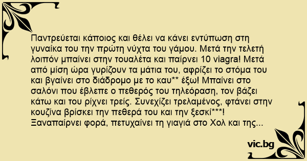 Παντρεύεται κάποιος και θέλει να κάνει εντύπωση στη γυναίκα του την πρώτη νύχτα του γάμου. Μετά την τελετή λοιπόν μπαίνει στην τουαλέτα και παίρνει 10 viаgrа! Μετά από μίση ώρα γυρίζουν τα μάτια του, αφρίζει το στόμα του και βγαίνει στο διάδρομο με το καυ** έξω! Μπαίνει στο σαλόνι που έβλεπε ο πεθερός του τηλεόραση, τον βάζει κάτω και του ρίχνει τρείς. Συνεχίζει τρελαμένος, φτάνει στην κουζίνα βρίσκει την πεθερά του και την ξεσκί***!