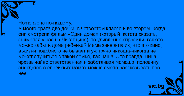 У моего брата две дочки, в четвертом классе и во втором. Когда они смотрели фильм «Один дома» (который, кстати сказать, снимался у нас на Чикагщине), то удивленно спросили, как это можно забыть дома ребенка? Мама заверила их, что это кино, в жизни подобного не бывает и уж точно никогда-никогда не может случиться в такой семье, как наша. Это правда, Лина чрезвычайно ответственная и заботливая мамаша, половину анекдотов о еврейских мамах можно смело рассказывать про нее. Но жизнь полна сюрпризов.
