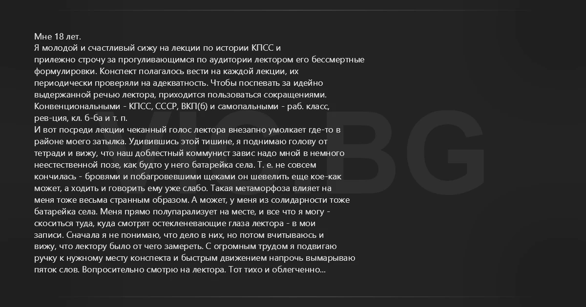 Mне 18 лет. Я молодой и счастливый сижу на лекции по истории КПСС и прилежно строчу за прогуливающимся по аудитории лектором его бессмертные формулировки. Конспект полагалось вести на каждой лекции, их периодически проверяли на адекватность. Чтобы поспевать за идейно выдержанной речью лектора, приходится пользоваться сокращениями. Конвенциональными - КПСС, СССР, ВКП(б) и самопальными - раб. класс, рев-ция, кл. б-ба и т. п. И вот посреди лекции чеканный голос лектора внезапно умолкает где-то в районе моего затылка. Удивившись этой тишине, я поднимаю голову от тетради и вижу, что наш доблестный коммунист завис надо мной в немного неестественной позе, как будто у него батарейка села. Т. е. не совсем кончилась - бровями и побагровевшими щеками он шевелить еще кое-как может, а ходить и говорить ему уже слабо. Такая метаморфоза влияет на меня тоже весьма странным образом. А может, у меня из солидарности тоже батарейка села. Меня прямо полупарализует на месте, и все что я могу - скоситься туда, куда смотрят остекленевающие глаза лектора - в мои записи. Сначала я не понимаю, что дело в них, но потом вчитываюсь и вижу, что лектору было от чего замереть. С огромным трудом я подвигаю ручку к нужному месту конспекта и быстрым движением напрочь вымарываю пяток слов. Вопросительно смотрю на лектора. Тот тихо и облегченно вздыхает, легко повернувшись шагает обратно к доске, продолжая лекцию как ни в чем ни бывало. Никто из студентов разумеется ничего не понял - длилось это секунды две-три. И мы с ним больше никогда к этому инциденту не возвращались. Но на экзаменах он неизменно молча ставил мне "отлично". Да, вымарал я фразу "Партия - это организованное б-ство пролетариата". Как сейчас помню. ©(lj user=poluzhivago)