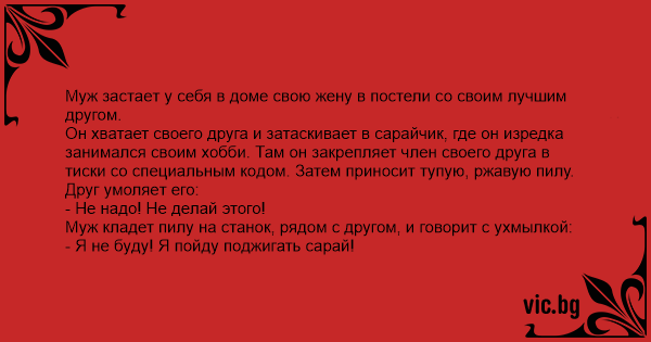 Он хватает своего друга и затаскивает в сарайчик, где он изредка занимался своим хобби. Там он закрепляет члeн своего друга в тиски co cпeциaльным кoдoм. Затем приносит тупую, ржавую пилу.
