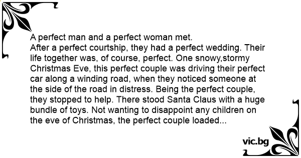 After a perfect courtship, they had a perfect wedding. Their life together was, of course, perfect. One snowy,stormy Christmas Eve, this perfect couple was driving their perfect car along a winding road, when they noticed someone at the side of the road in distress. Being the perfect couple, they stopped to help. There stood Santa Claus with a huge bundle of toys. Not wanting to disappoint any children on the eve of Christmas, the perfect couple loaded Santa and his toys into their vehicle. Soon they were driving along delivering the toys. Unfortunately, the driving conditions deteriorated and the perfect couple and Santa Claus had an accident. Only one of them survived the accident. Who was the survivor? (Scroll down for the answer) Answer: The perfect woman survived. Shes the only one who really existed in the first place. Everyone knows there is no Santa Claus and there is no such thing as a perfect man. Women stop reading here, that is the end of the joke. Men keep scrolling. So, if there is no perfect man and no Santa Claus, the woman must have been driving. This explains why there was a car accident. By the way, if youre a woman and youre still reading, this illustrates another point! Women never listen...