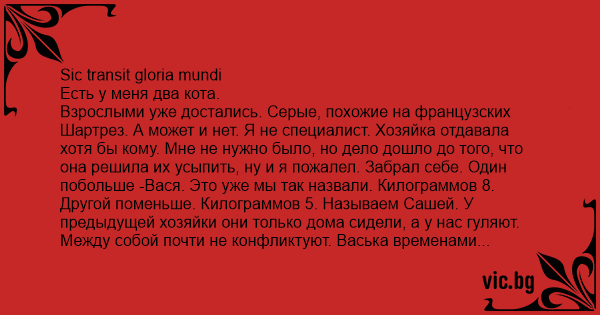 Взрослыми уже достались. Серые, похожие на французских Шартрез. А может и нет. Я не специалист. Хозяйка отдавала хотя бы кому. Мне не нужно было, но дело дошло до того, что она решила их усыпить, ну и я пожалел. Забрал себе. Один побольше -Вася. Это уже мы так назвали. Килограммов 8. Другой поменьше. Килограммов 5. Называем Сашей. У предыдущей хозяйки они только дома сидели, а у нас гуляют. Между собой почти не конфликтуют. Васька временами рыкнет на Сашку. Он почти не мяукает и то очень тихо. Я сначала везде за ним по улице ходил. Боялся, что даже не услышу, если где за забор забредёт. Но они быстро освоились. Сначала разогнали бурундуков. Те жрали то клубнику, то петрушку. Исчезли в тумане. Потом пропали белки. Жрали яблоки, помидоры, персики. Чё я только не делал? И разные лоскуты вывешивал, и сеткой прикрывал, и филинов расставлял - ничего не помогало! А то пропали, даже не вижу. Временами слышу где-то у соседей. А по территории только такие серые молнии сверкают. Вот... Потом я им сделал такой лаз в окне и они стали и ночью гулять. Тут пришла очередь соседских котов. Их раньше много разных к нам приходило. Как эти войны происходили я не видел, временами слышал отголоски. Но одна кошка осталась. Такая же серая. А наглая... Санька за нею приупадал, хотя они и кастрированные. А Васька и рычал, и лапой потянуть пробовал... Он рычит, а она подойдёт и морду ему лижет. Так и ходит теперь, когда хочет. Мы им просто хорошую еду покупаем, органическую, без добавок зерна. Как для себя в общем. Вот соседи к трапезе и подтягивались.