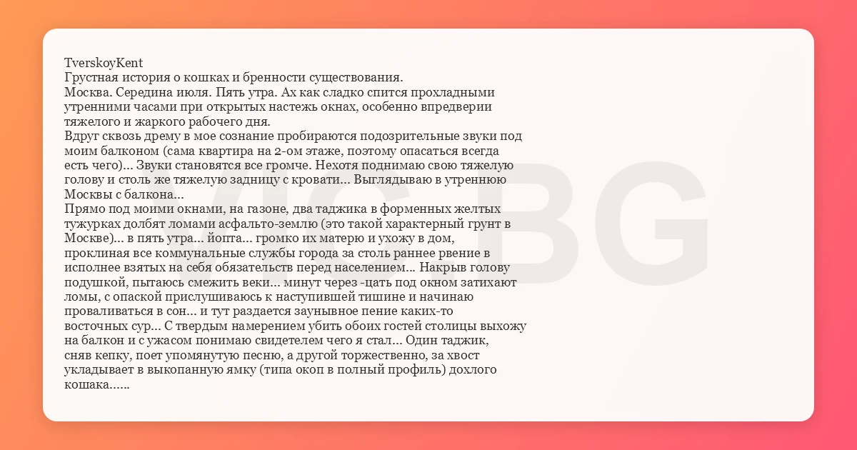 Москве)... в пять утра... йопта... громко их матерю и ухожу в дом,