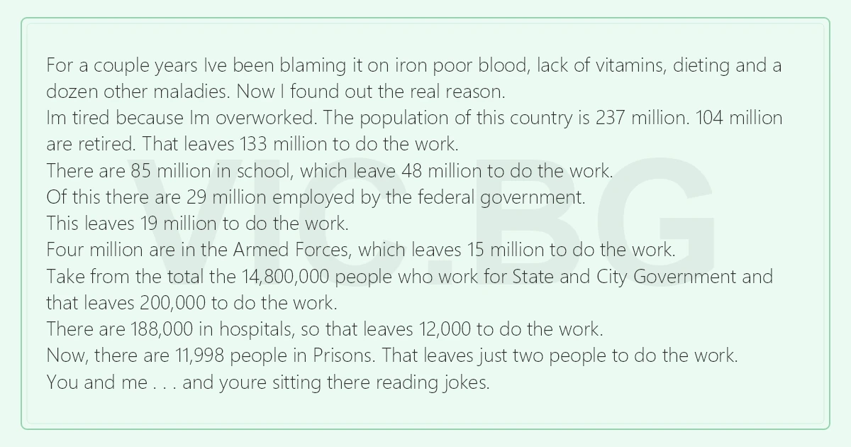For a couple years Ive been blaming it on iron poor blood, lack of vitamins, dieting and a dozen other maladies. Now I found out the real reason. Im tired because Im overworked. The population of this country is 237 million. 104 million are retired. That leaves 133 million to do the work. There are 85 million in school, which leave 48 million to do the work. Of this there are 29 million employed by the federal government. This leaves 19 million to do the work. Four million are in the Armed Forces, which leaves 15 million to do the work. Take from the total the 14,800,000 people who work for State and City Government and that leaves 200,000 to do the work. There are 188,000 in hospitals, so that leaves 12,000 to do the work. Now, there are 11,998 people in Prisons. That leaves just two people to do the work. You and me . . . and youre sitting there reading jokes.