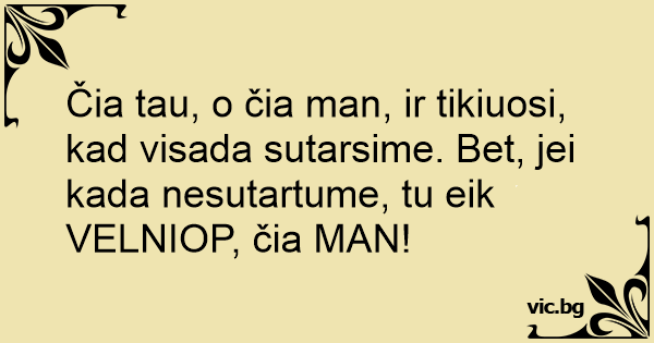Čia tau, o čia man, ir tikiuosi, kad visada sutarsime. Bet, jei kada nesutartume, tu eik VELNIOP, čia MAN!