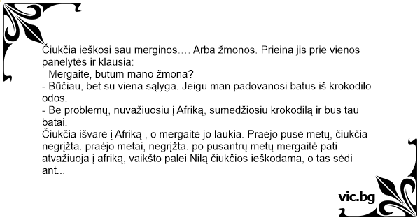 Čiukčia išvarė į Afriką , o mergaitė jo laukia. Praėjo pusė metų, čiukčia negrįžta. praėjo metai, negrįžta. po pusantrų metų mergaitė pati atvažiuoja į afriką, vaikšto palei Nilą čiukčios ieškodama, o tas sėdi ant kranto su meškere, sugauna krokodilą, pasižiūri i jį ir išmesdamas atgal į upę sako: