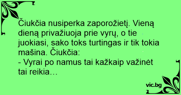 Čiukčia nusiperka zaporožietį. Vieną dieną privažiuoja prie vyrų, o tie juokiasi, sako toks turtingas ir tik tokia mašina. Čiukčia: