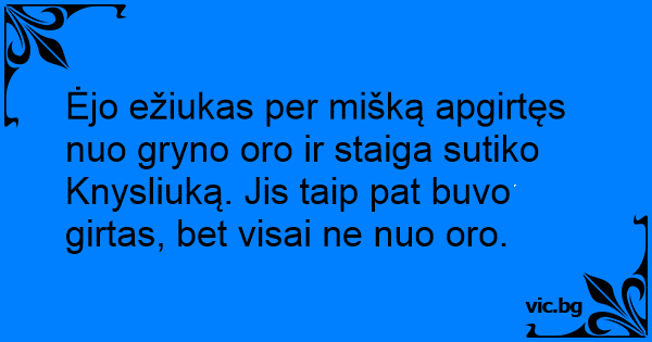 Ėjo ežiukas per mišką apgirtęs nuo gryno oro ir staiga sutiko Knysliuką. Jis taip pat buvo girtas, bet visai ne nuo oro.