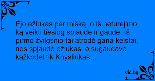Ėjo ežiukas per mišką, o iš neturėjimo ką veikti tiesiog spjaudė ir gaudė. Iš pirmo žvilgsnio tai atrodė gana keistai, nes spjaudė ežiukas, o sugaudavo kažkodėl tik Knysliukas…