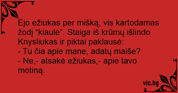 Ėjo ežiukas per mišką, vis kartodamas žodį “kiaulė”. Staiga iš krūmų išlindo Knysliukas ir piktai paklausė:
