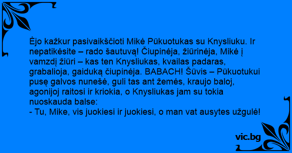 Ėjo kažkur pasivaikščioti Mikė Pūkuotukas su Knysliuku. Ir nepatikėsite – rado šautuvą! Čiupinėja, žiūrinėja, Mikė į vamzdį žiūri – kas ten Knysliukas, kvailas padaras, grabalioja, gaiduką čiupinėja. BABACH! Šūvis – Pūkuotukui pusę galvos nunešė, guli tas ant žemės, kraujo baloj, agonijoj raitosi ir kriokia, o Knysliukas jam su tokia nuoskauda balse: