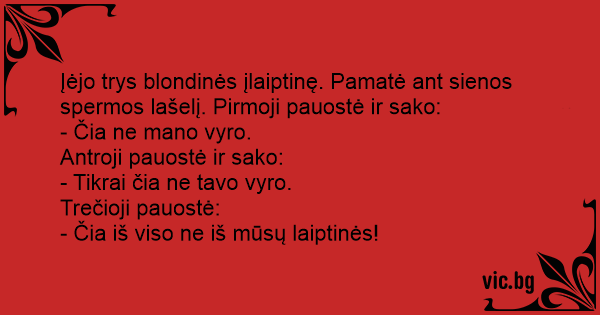 Įėjo trys blondinės įlaiptinę. Pamatė ant sienos spermos lašelį. Pirmoji pauostė ir sako: