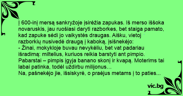 - Žinai, mokykloje buvau nevykėliu, bet vat padariau išradimą: miltelius, kuriuos reikia barstyti ant pimpio. Pabarstai – рiмрis įgyja banano skonį ir kvapą. Moterims tai labai patinka, todėl uždirbu milijonus…