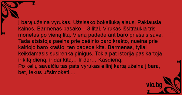 Į barą užeina vyrukas. Užsisako bokaliuką alaus. Paklausia kainos. Barmenas pasako – 3 litai. Virukas išsitraukia tris monetas po vieną litą. Vieną padeda ant baro priešais save. Tada atsistoja paeina prie dešinio baro krašto, nueina prie kairiojo baro krašto, ten padeda kitą. Barmenas, tyliai keikdamasis susirenka pinigus. Tokia pat istorija pasikartoja ir kitą dieną, ir dar kitą… Ir dar… Kasdieną.