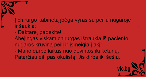 Į chirurgo kabinetą įbėga vyras su peiliu nugaroje ir šaukia: