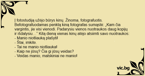 Į fotostudiją užėjo būrys kinų. Žinoma, fotografuotis. Befotografuodamas penktą kiną fotografas sumąstė: „Kam čia vargintis, jie visi vienodi. Padarysiu vienos nuotraukos daug kopijų ir išdalysiu…“ Kitą dieną vienas kinų atėjo atsiimti savo nuotraukos:
