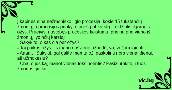0 Loading ... Kapinėse eina laidotuvių procesija. Paskui grabą eina ožys, o už jo daugybė žmonių. Vienas praeivis susidomėjo ir priėjęs prie procesijos klausia: - Kas numirė? Vienas vyras, juodu...