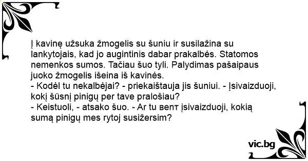 - Keistuoli, - atsako šuo. - Ar tu веnт įsivaizduoji, kokią sumą pinigų mes rytoj susižersim?