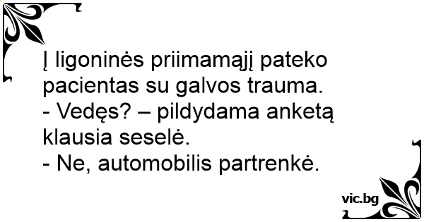 Į ligoninės priimamąjį pateko pacientas su galvos trauma. - Vedęs? – pildydama anketą klausia seselė. - Ne, automobilis partrenkė.