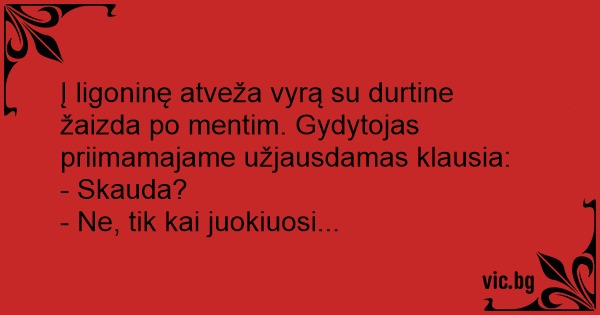 Į ligoninę atveža vyrą su durtine žaizda po mentim. Gydytojas priimamajame užjausdamas klausia: