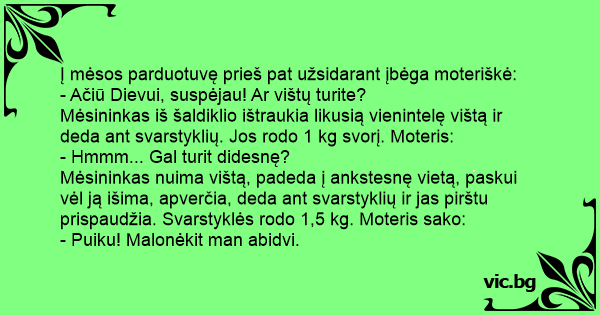 Mėsininkas nuima vištą, padeda į ankstesnę vietą, paskui vėl ją išima, apverčia, deda ant svarstyklių ir jas pirštu prispaudžia. Svarstyklės rodo 1,5 kg. Moteris sako: