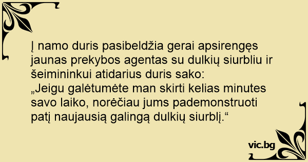 Į namo duris pasibeldžia gerai apsirengęs jaunas prekybos agentas su dulkių siurbliu ir šeimininkui atidarius duris sako: