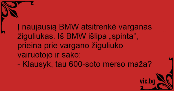 Į naujausią BMW atsitrenkė varganas žiguliukas. Iš BMW išlipa „spinta“, prieina prie vargano žiguliuko vairuotojo ir sako: