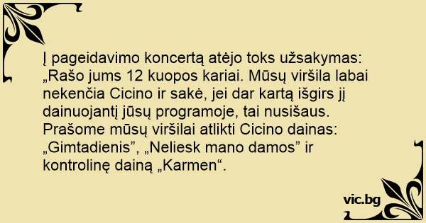 Į pageidavimo koncertą atėjo toks užsakymas: „Rašo jums 12 kuopos kariai. Mūsų viršila labai nekenčia Cicino ir sakė, jei dar kartą išgirs jį dainuojantį jūsų programoje, tai nusišaus. Prašome mūsų viršilai atlikti Cicino dainas: „Gimtadienis”, „Neliesk mano damos” ir kontrolinę dainą „Karmen“.