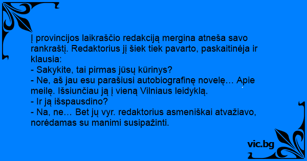 Į provincijos laikraščio redakciją mergina atneša savo rankraštį. Redaktorius jį šiek tiek pavarto, paskaitinėja ir klausia: