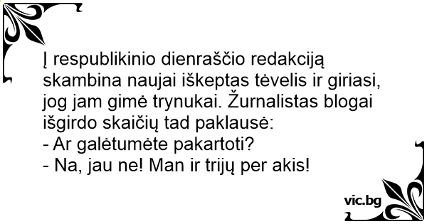 Į respublikinio dienraščio redakciją skambina naujai iškeptas tėvelis ir giriasi, jog jam gimė trynukai. Žurnalistas blogai išgirdo skaičių tad paklausė: