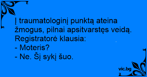 Į traumatologinį punktą ateina žmogus, pilnai apsitvarstęs veidą. Registratorė klausia: