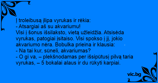 Visi į šonus išsilaksto, vietą užleidžia. Atsisėda vyrukas, patogiai įsitaiso. Visi spokso į jį, jokio akvariumo nėra. Bobulka prieina ir klausia: