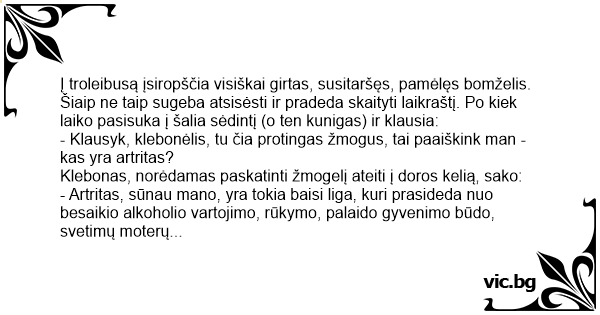 - Klausyk, klebonėlis, tu čia protingas žmogus, tai paaiškink man - kas yra artritas?
