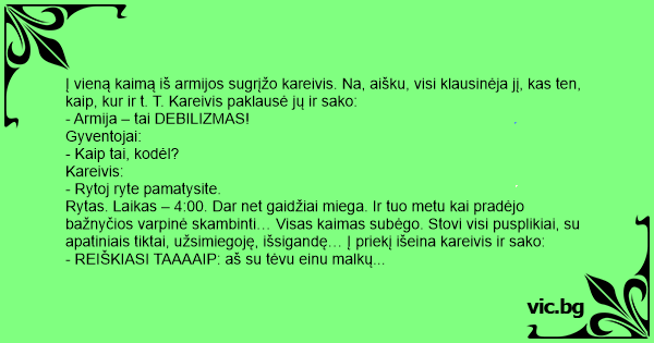 Į vieną kaimą iš armijos sugrįžo kareivis. Na, aišku, visi klausinėja jį, kas ten, kaip, kur ir t. T. Kareivis paklausė jų ir sako: